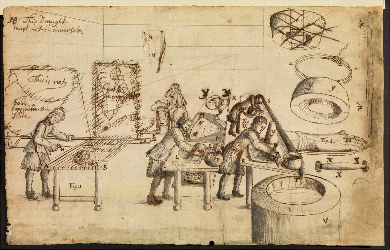 Drawing by Hooke of feltmakers at work. Note the instructions to the engraver (left) – but this image seems not to have been printed. © The Royal Society