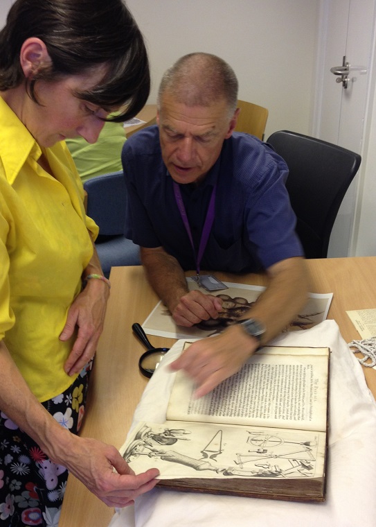 21 July 2104 Stuart and Anne-Marie1Thanks to the University of Exeter’s Catalyst seed fund and the Exeter Cathedral Library, I was able to run two half-day workshops bringing artists and creative writers together to see an original copy of Micrographia, do some microscopy, and reflect on these experiences in their art or writing. I was really lucky to be able to recruit some fantastic collaborators to help present the workshops: the artist Amy Shelton and poet Matthew Francis, my colleagues Katie Solomon and Mark Ramsdale from the School of Biosciences at the University of Exeter, and very importantly, Ann Barwood and Stuart MacWilliam from the Exeter Cathedral Library. Ann and Stuart allowed us to have Micrographia in the room with us all day, giving people plenty of time to read the text and look at the amazing illustrations up close.