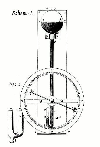 He published a drawing of his wheel barometer in Micrographia. The ‘J’ shaped glass tube is filled with mercury, and has a sealed bulb at the top but is open at the other end. In the bulb a vacuum provides enough suction to prevent the mercury from flowing out of the tube. At the open end of the tube a ball floats on the mercury. This float is attached to the pointer on the dial by a length of string. If the air pressure rises the mercury is forced up into the bulb and the level of the mercury at the open end drops. As the float drops too, the pointer moves.